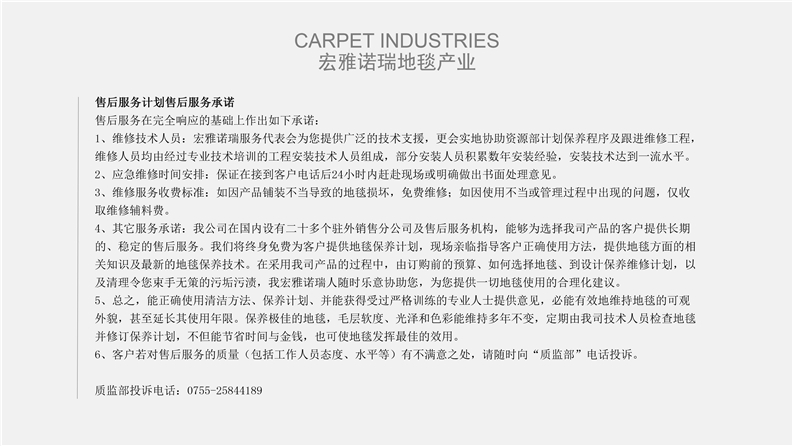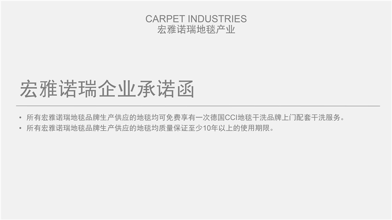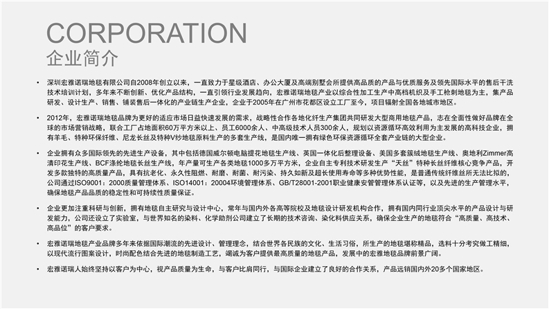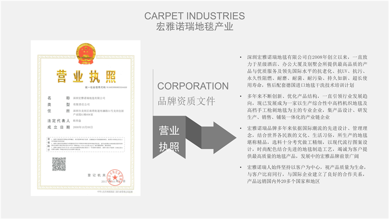 深圳宏雅諾瑞地毯有限公司自2008年創立以來,一直致力于星級酒店、辦公大廈及高端別墅會所提供高品質的產品與優質服務及領先國際水平的售后干洗技術培訓計劃,多年來不斷創新、優化產品結構,一直引領行業發展趨向,宏雅諾瑞地毯產業以綜合性加工生產中高檔機織及手工槍刺地毯為主,集產品研發、設計生產、銷售、鋪裝售后一體化的產業鏈生產企業,企業于2005年在廣州市花都區設立工廠至今,項目輻射全國各地城市地區。
